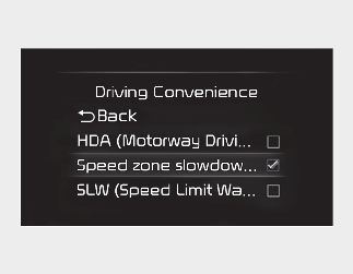 With the ignition switch or ENGINE START/STOP button in the On position, select 'User Settings → Driver Assistance → Driving Convenience' at the infotainment system to set whether to use each function.