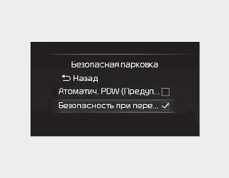 При перезапуске двигателя функция предотвращения столкновения с объектами, движущимися в поперечном направлении позади автомобиля, всегда включается. Однако в случае выбора «Off» (Выкл.) после перезапуска двигателя водитель должен внимательно следить за ситуацией на дороге и соблюдать правила безопасности.