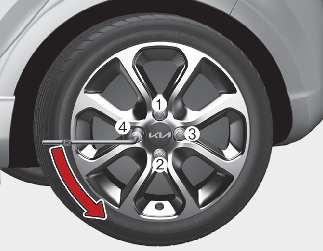 Then position the wrench as shown in the drawing and tighten the wheel nuts. Be sure the socket is seated completely over the nut. Do not stand on the wrench handle or use an extension pipe over the wrench handle. Go around the wheel tightening every other nut until they are all tight. Then double-check each nut for tightness. After changing wheels, have the system checked by a professional workshop. Kia recommends to visit an authorized Kia dealer/service partner.