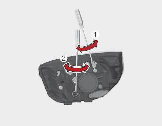 To aim the low and high beams left or right, turn the driver (1) clockwise or counterclockwise. To aim the low and high beams up or down, turn the driver (2) clockwise or counterclockwise.
