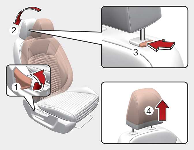 - Press the headrest release button (3) whilst pulling the headrest up (4).