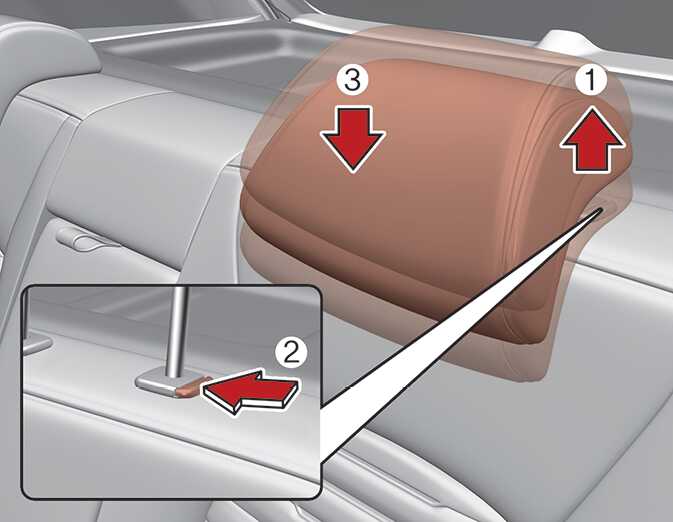 - To lower the headrest, push and hold the release button (2) on the headrest support and lower the headrest to the desired position (3).