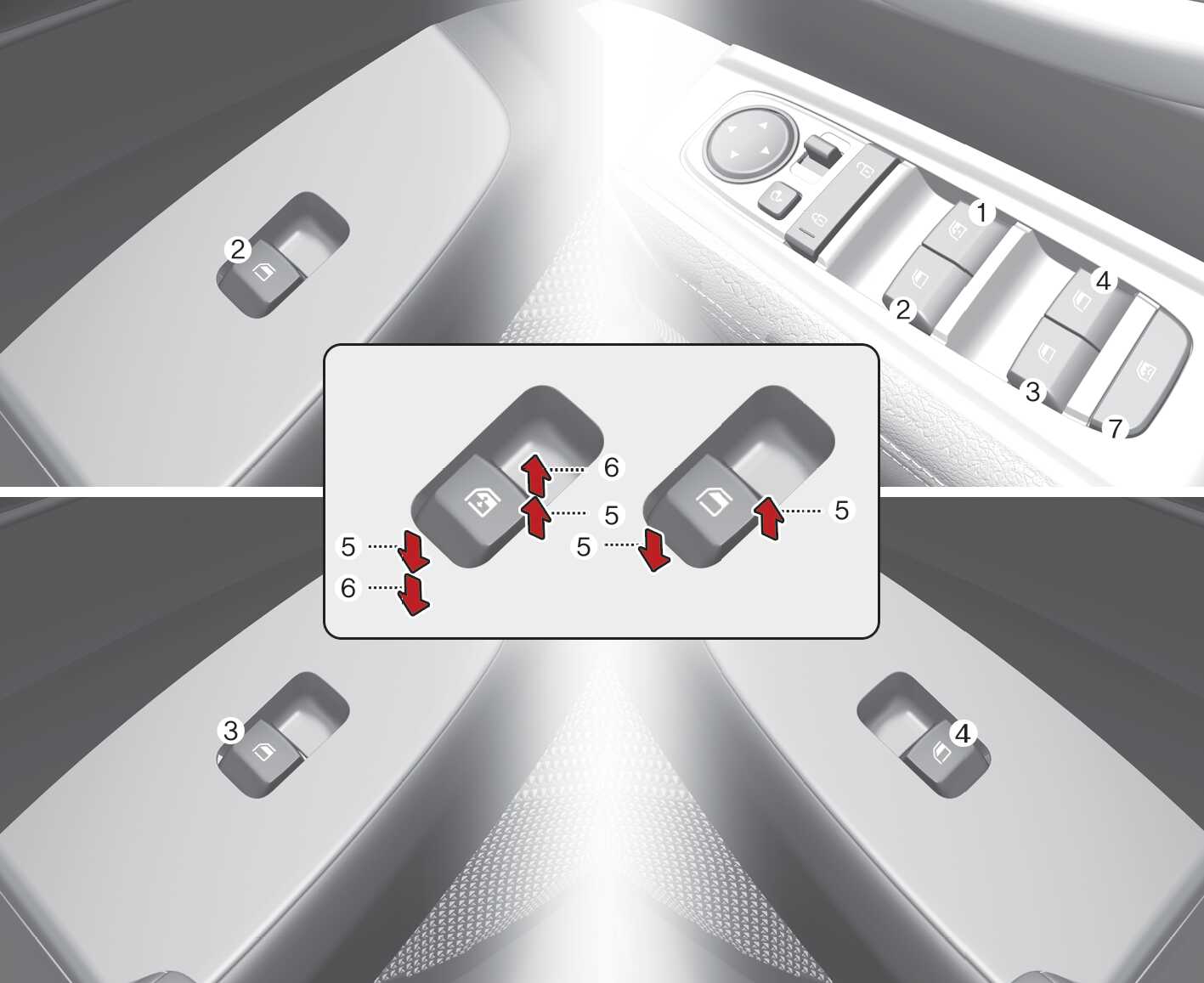 Each door has a power window switch that controls the door's window. The driver has a power window lock button which can block the operation of rear passenger windows. The power windows can be operated for approximately 3 minutes after the ignition key is removed or turned to the ACC or LOCK position. However, if the front doors are opened, the power windows cannot be operated even within the 3 minutes period.