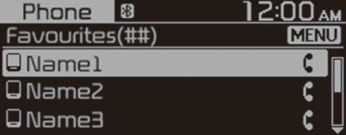 From the Phone screen, turn the [ TUNE] knob on the control panel to select Favourites, and then press the knob.
