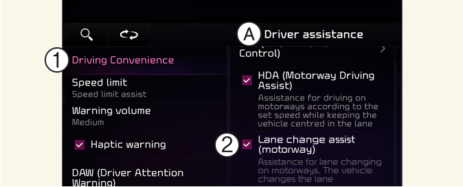 Ako se odabere Pomoć pri promjeni trake na autocesti, to pomaže u sigurnoj promjeni traka.