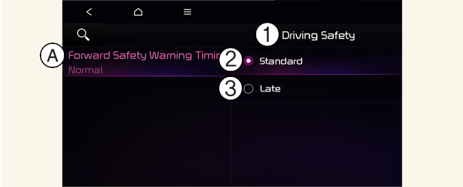 Postavke sigurnosti sprijeda uključuju osnovnu funkciju, funkciju sretanja u raskrižju i funkciju izravnog nadolaska sprijeda. Sigurnost vožnje kod vozila koja ulaze u putanju vožnje naprijed uključuje funkciju Prolazak kroz križanje. Sigurnost sprijeda/bočno sadrži funkciju nadolazeće promjene vozne trake i funkciju pomoći kod upravljanja u cilju izbjegavanja. (Ako je opremljeno)