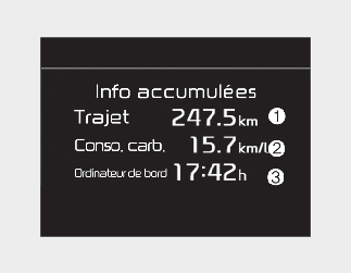 Cet affichage donne des informations sur la distance du trajet (1), le rendement moyen en carburant (2) et la durée totale du trajet (3) une fois par cycle d'allumage.