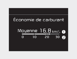 L'économie moyenne de carburant est calculée à partir de la distance totale parcourue et de la consommation de carburant depuis la dernière réinitialisation de l'économie moyenne.