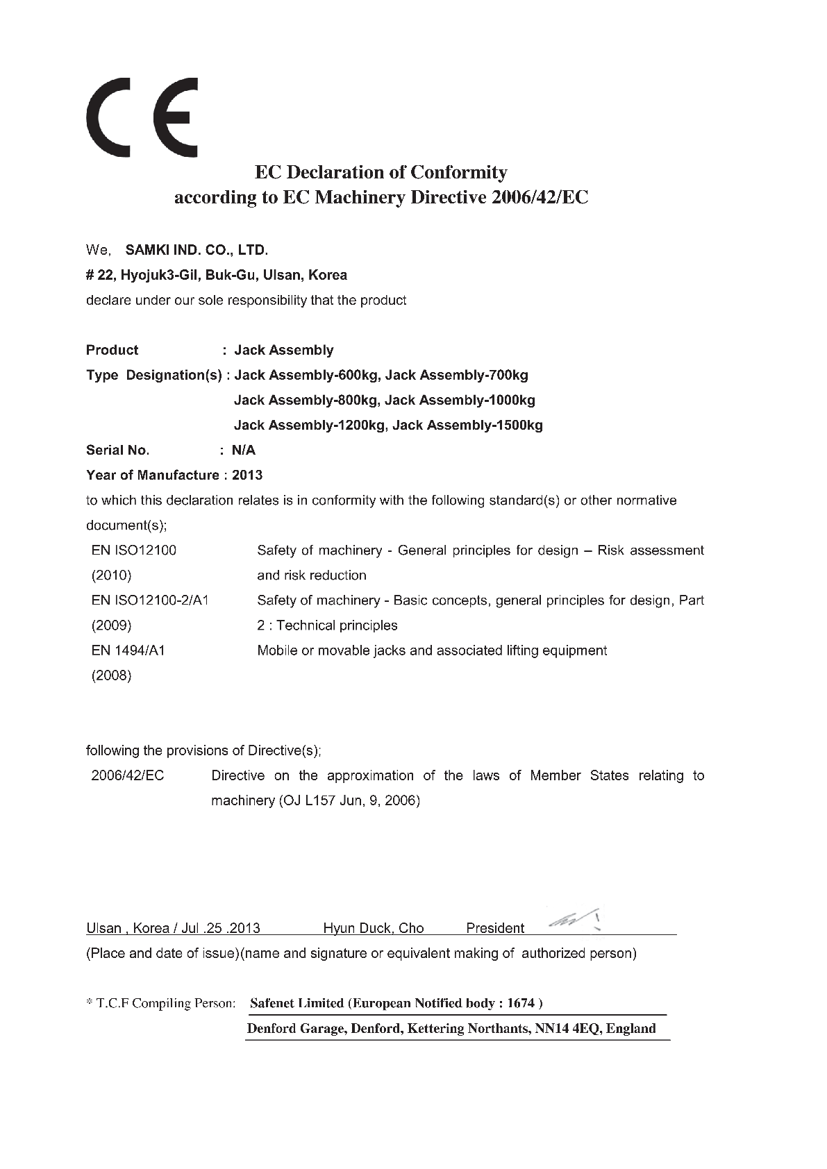 Declarație de conformitate pentru cric