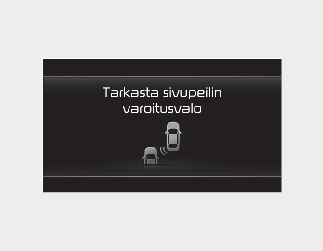 Kun ulkopuolisen taustapeilin varoitusvalo ei toimi kunnolla, varoitusviesti "Check side view mirror warning light" (Tarkista sivutaustapeilin varoitusvalo) ilmestyy kojelautaan. Suosittelemme, että annat valtuutetun Kia-jälleenmyyjän/-huoltokumppanin tarkastaa auton.