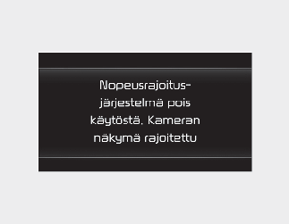 Jos näin tapahtuu, "Speed limit system disabled. Camera obscured” (Nopeusrajoitusjärjestelmä deaktivoitu. Kamera estetty) varoitusviesti ilmestyy kojelautaan. Toiminto toimii normaalisti, kun lumi, vesi tai vierasaine poistetaan.