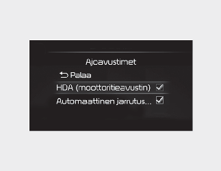 Jos moottoritieavustin on valittu, se auttaa pitämään turvaväliä edessä ajavaan ajoneuvoon, säilyttämään vakionopeutta ja pitämään auton kaistalla.