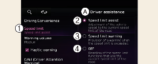 Der Tempolimitassistent funktioniert basierend auf der Differenzeinstellung, die zum Tempolimit zugefügt wird. Setzen Sie den Offset-Wert auf „0“, um die Geschwindigkeit entsprechend der erkannten Geschwindigkeitsgrenze zu ändern bzw. eine Warnung auszugeben.
