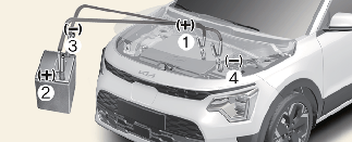 缺電電池 (3) 的負極 (-) 端子與接地點 (4)。