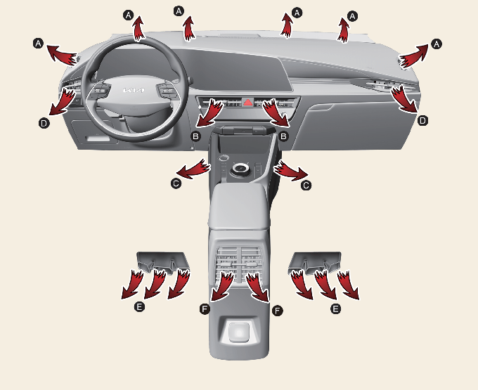 Padlószint (A, C, D, E, F)A levegő nagy része a padló felé áramlik, egy kis része pedig a szélvédő, az oldalsó ablakok jégmentesítője és az oldalsó szellőzők felé irányul.