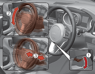 • Pull down the lock release lever (1), adjust the steering wheel to the desired angle (2) and height (3), then pull up the lockrelease lever to lock the steering wheel in place.