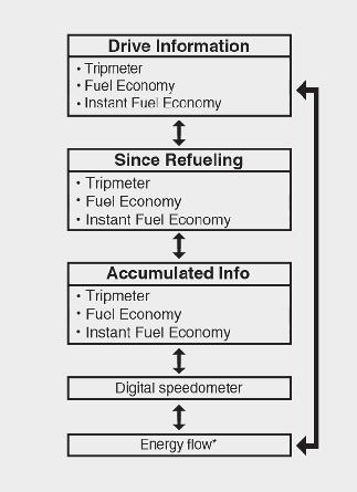 This display shows the trip distance (1), the average fuel efficiency (2), and the instant fuel economy (3), and the total driving time (4) information once per one ignition cycle.