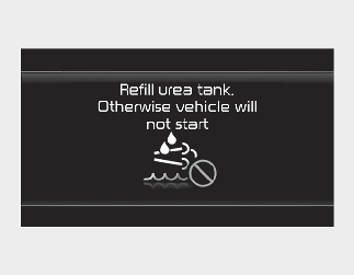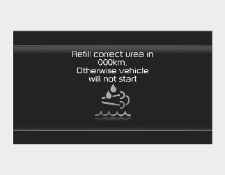 Otherwise, the vehicle can't be restarted once the engine is turned off by the ENGINE START/STOP button. Based on the driving pattern, environmental condition and road profile, the deducted remaining mileage may differ from the actual travel distance. When "Low Urea" or "Refill Urea" message is displayed, a sufficient amount of urea solution must be added. When "Refill Urea in 000 km or vehicle will not start" message is displayed, refill a sufficient amount of urea solution.