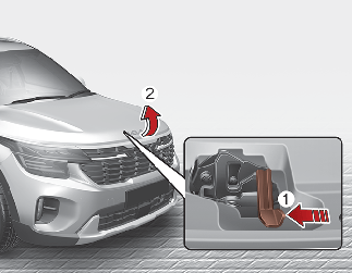Go to the front of the vehicle, raise the bonnet slightly, push the secondary bonnet release lever (1) up side and lift the