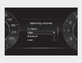 Warning volume : Select ‘User settings → Driver assistance → Warning volume’ on the LCD display or ‘Settings → Vehicle → Driver assistance → Warning methods’ on the Infotainment system.