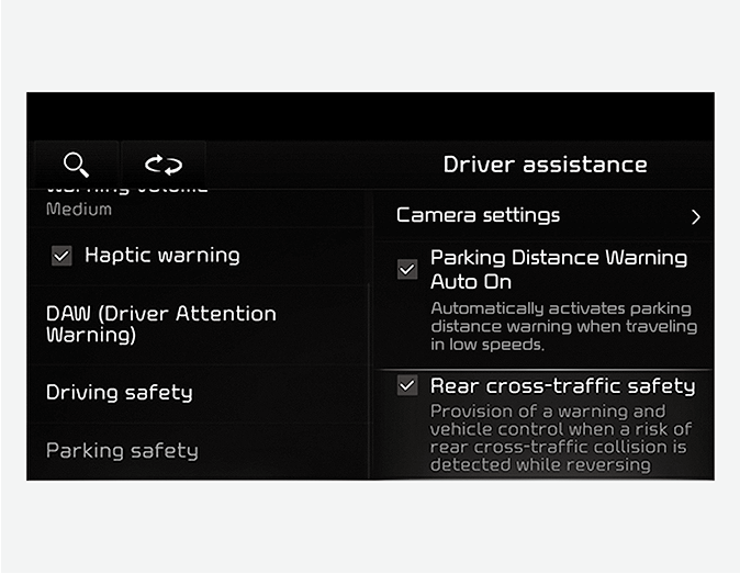 With ENGINE START/STOP button in the ON position, select ‘User settings → Driver assistance → Parking safety’ on the LCD display or ‘Settings → Vehicle → Driver assistance → Parking safety’ on the Infotainment system screen to turn on Rear Cross-Traffic Collision-Avoidance Assist.