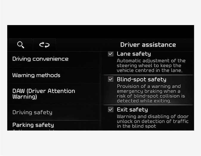 With ENGINE START/STOP button in the ON position, select ‘User settings → Driver assistance → Driving safety’ on the LCD display or ‘Settings → Vehicle → Driver assistance → Driving safety’ on the Infotainment system screen to set whether to use the function.