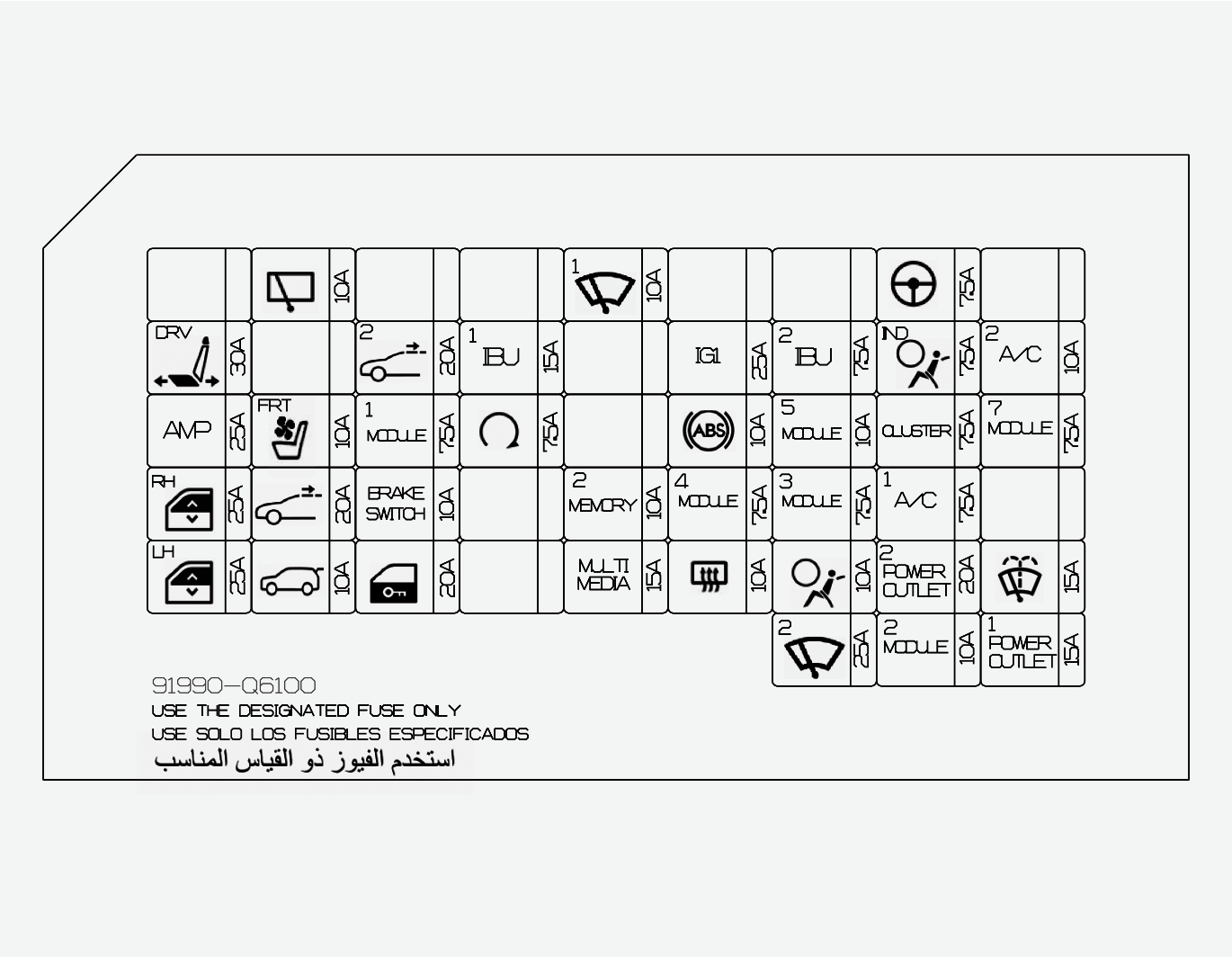 ICU Junction Block (Fuse - Driver Seat Manual Switch, AMP (Amplifier), Power Window Relay RH, Driver Safety Power Window Module, Power Window Relay LH, Driver Safety Power Window Module, Front Air Ventilation Seat Control Module, Sunroof Unit, Tail Gate Relay) |