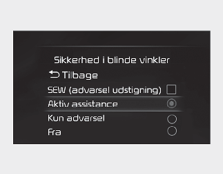 Med tændingskontakten eller MOTORENS START/STOP-knap i tændt position skal du vælge “Brugerindstillinger → Førerassistance → Blindvinkel-sikkerhed” på LCD-displayet eller infotainmentsystemet for at indstille, om hver funktion skal bruges.