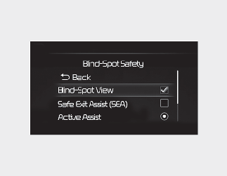 With the ENGINE START/STOP button in the ON position, select 'Driver Assistance → Blind-Spot Safety → Blind Spot View' from the Settings menu to turn on Blind-Spot View Monitor and deselect to turn off the function.