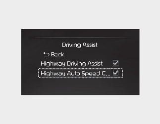 With the ENGINE START/STOP button in the ON position, select 'Driver Assistance → Driving Assist → Highway Auto Speed Change' from the Settings menu to turn on Navigation-based Smart Cruise Control and deselect to turn off the function.