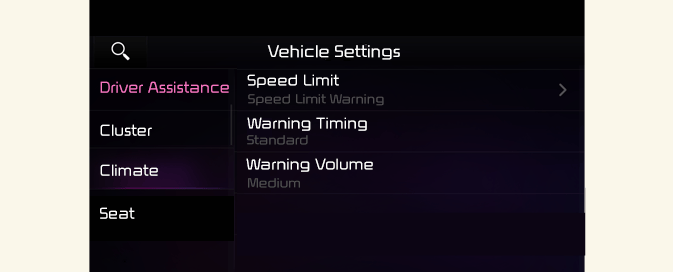 Selezionare Impostazioni → Veicolo → Assistenza conducente nella schermata del sistema infotainment per impostare la funzione Assistenza conducente.