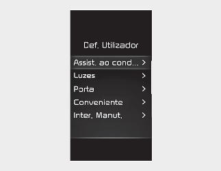Para alterar as definições de Assist. ao condutor, prima o botão OK no volante durante mais de 1 segundo quando o modo Assistência à condução for apresentado.