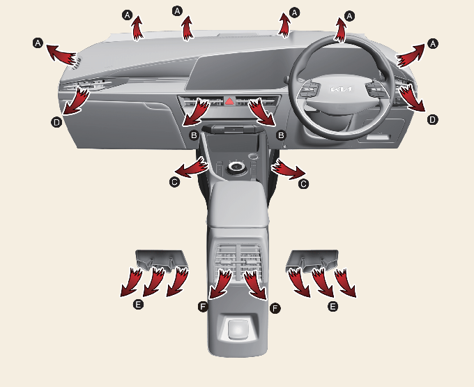 Niveau plancher (A, C, D, E, F)L'essentiel du flux d'air est dirigé vers le plancher tandis qu'une petite partie est dirigée vers le pare-brise, les dégivreurs des vitres latérales et les aérations arrière.