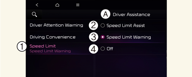 Avertissement de limite de vitesse et Assistance à la limite de vitesse avertissent le conducteur lorsque la vitesse de conduite dépasse la vitesse à laquelle le décalage de limite de vitesse défini est ajouté à la limite de vitesse, ou applique le décalage de limite de vitesse défini à la limite de vitesse détectée.