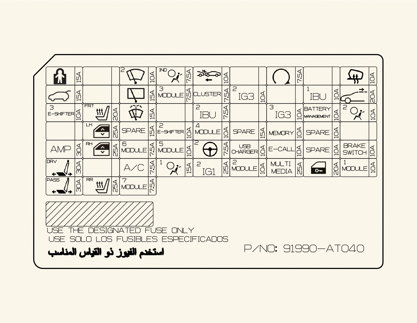 BLOC DE JONCTION ICU (FUSIBLE -MODULE2, CHARGEUR USB, AIRBAG1, IBU2, MDPS2, COMBINÉ D'INSTRUMENTS, MODULE3, AIRBAG IND, MODULE4, MODULE5, LEVIER DE VITESSE ÉLECTRIQUE2, FCA, ING1 2 ) |
