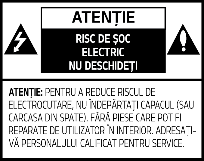 Pentru a reduce riscul de electrocutare, nu îndepărtați capacul sau carcasa din spate a acestui produs. Nu există piese care pot fi reparate de utilizator în interiorul dispozitivului. Adresați-vă personalului calificat pentru service.