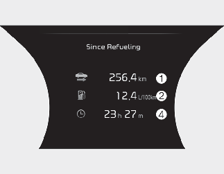 Acest afișaj arată distanța de deplasare acumulată (1), consumul mediu de combustibil (2), consumul instantaneu de combustibil (3) și informații privind timpul total de conducere (4) după alimentare.