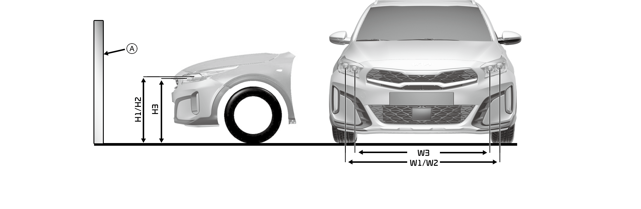 * Dacă este nevoie de direcționarea farurilor, ajustați direcția după ce măsurați efectiv garda la sol a unui vehicul sau vizitați Kia recommends pentru a discuta cu un dealer/service partener autorizat Kia. Acest lucru se întâmplă deoarece aceasta poate fi diferită de garda la sol reală a unui vehicul.