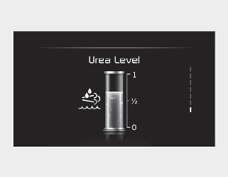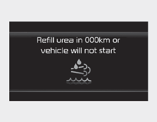 În caz contrar, vehiculul nu poate fi repornit atunci când motorul este oprit de la butonul ENGINE START/STOP. Pe baza tiparului de conducere, a condițiilor de mediu și a tipului de drum, distanța dedusă rămasă poate fi diferită de distanța reală rămasă pentru rulare. Atunci când este afișat mesajul „Low Urea” sau „Refill Urea”, trebuie să se adauge o cantitate suficientă de soluție de uree. Atunci când este afișat mesajul „Refill Urea in 000 km or vehicle will not start” (Reumpleți cu soluție de uree în 000 km sau vehiculul nu va porni), reumpleți cu o cantitate suficientă de soluție de uree.