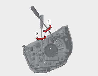 To aim the low and high beams left or right, turn the driver (1) clockwise or counterclockwise. To aim the low and high beams up or down, turn the driver (2) clockwise or counterclockwise.