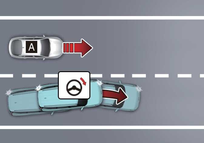 [A]: Pojazd nadjeżdżający Dzięki wspomaganiu kierownicy funkcja sygnalizacji zmiany pasa ruchu na przeciwny pomaga zapobiec kolizji z nadjeżdżającym pojazdem lub jednośladem silnikowym podczas zmiany pasa ruchu. |