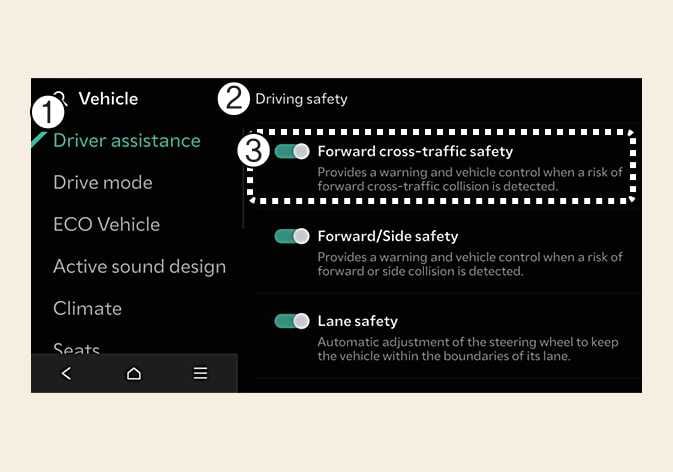 Po uruchomieniu pojazdu wybrać opcję na ekranie systemu multimedialnego, aby włączyć funkcję przejazdu przez skrzyżowanie lub usunąć zaznaczenie, aby ją wyłączyć.