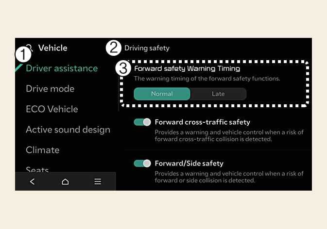 Po wybraniu opcji Późniejszy system asystenta unikania kolizji z przodu będzie wolniej ostrzegać kierowcę.