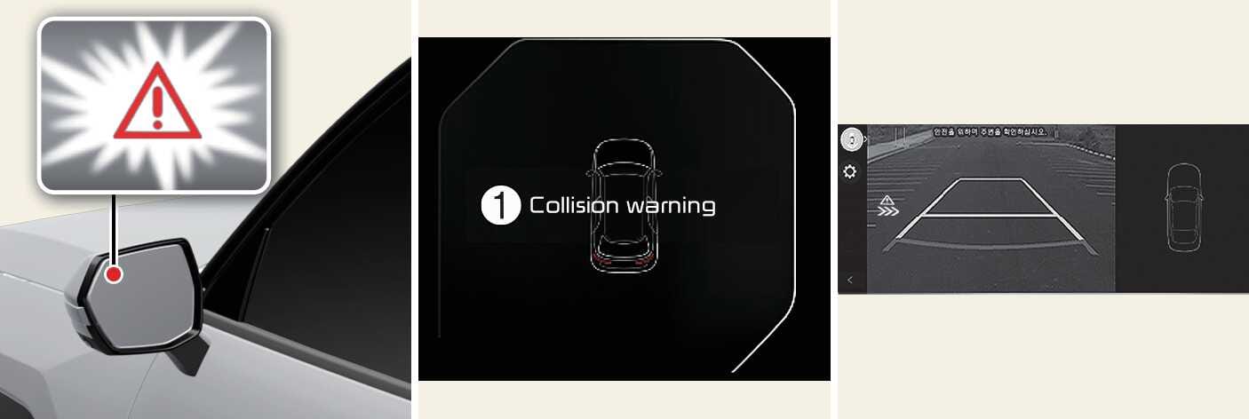 System ostrzegania przed kolizją informuje kierowcę za pomocą światła ostrzegawczego na zewnętrznej stronie lusterka wstecznego (lusterka zewnętrznego), komunikatu ostrzegawczego, słyszalnego ostrzeżenia i wibracji kierownicy.