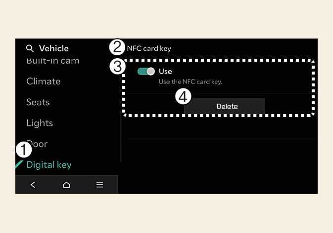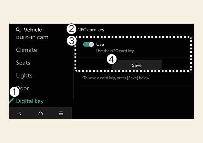 Aby użyć karty klucza jako Klucza cyfrowego 2, zarejestruj kartę klucz w systemie pojazdu zgodnie z poniższymi krokami.