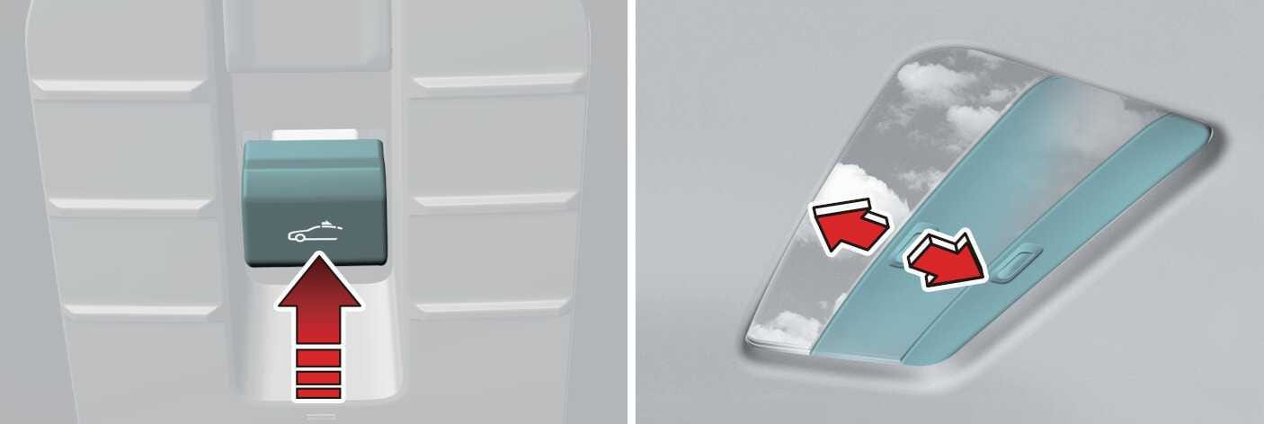Osłona przeciwsłoneczna otwiera się automatycznie po otwarciu szyby szyberdachu poprzez przesunięcie przełącznika szyberdachu (1) do tyłu, ale nie zamyka się automatycznie po zamknięciu szyby szyberdachu. Ponadto, gdy szyba okna dachowego jest otwarta, nie można zamknąć samej tylko osłony przeciwsłonecznej.