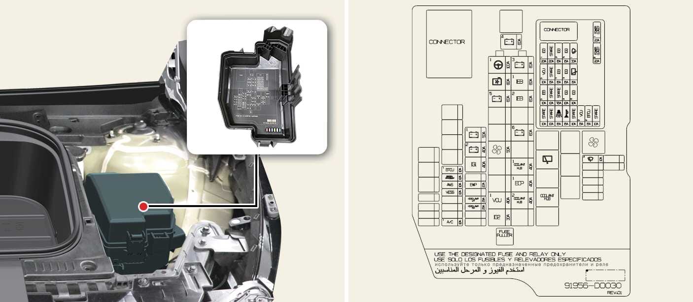 Łączówka ICU (przekaźnik długoterminowego zatrzasku ładunkowego, bezpiecznik: IAU, ECS, BATTERY MANAGEMENT, AIR BAG2, MEMORY1, SPARE3 (B+), A/C2, E-CALL, IBU1, BRAKE SWITCH, MULTIMEDIA, DOOR LOCK, MODULE1) |