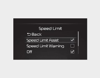 發動車輛時,從「設定」功能表選擇「駕駛輔助 → 速限」,以設定是否使用每項功能。