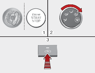 في غضون عشرة ثواني بعد ضبط وضع DEFOG (إزالة الضباب)، اضغط على زر السحب لمدة 5 ثوانٍ على الأقل و3 ثوانٍ على الأقل أثناء الضغط