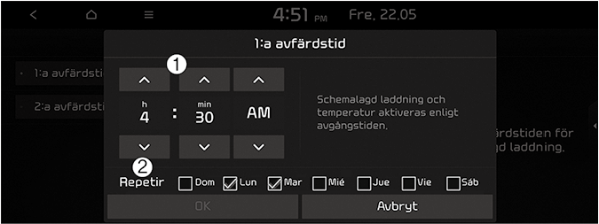 Välj dag: Välj veckodag för att aktivera schemalagd laddning och måltemperatur för avresetiden.